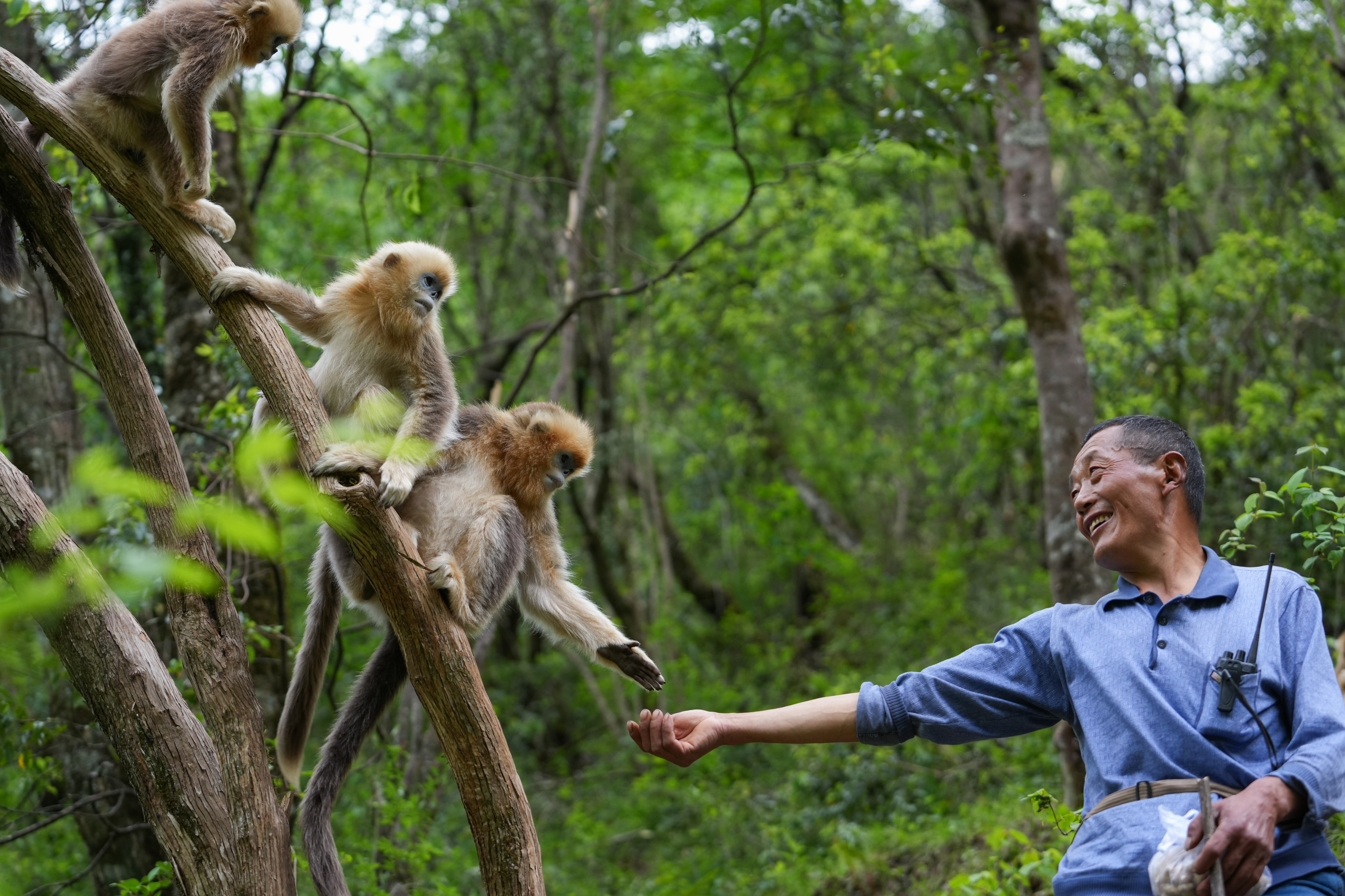 5月21日,巡护员徐庭友在巡护路上遇到几只小川金丝猴,喂金丝猴吃花生。 近年来,当地政府抓住大熊猫国家公园建设的契机,加大对与大熊猫高度伴生的川金丝猴、雪豹等珍稀物种的保护。新华社记者 江宏景摄